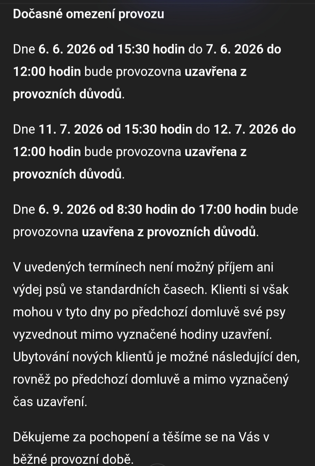 Od 1.listopadu 2024 rozšiřujeme po rekonstrukci vnitřní ubytovací prostory vč. kamerového systému a klimatizace pro Vaše psí parťáky v rodinném domě .. !! ♥